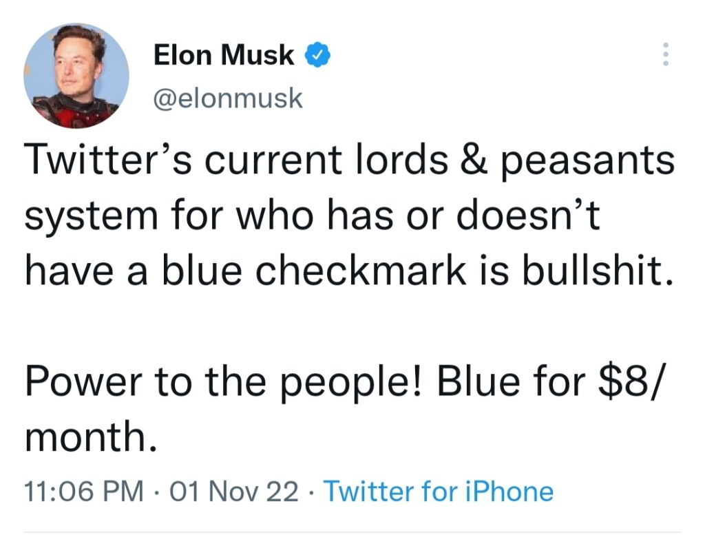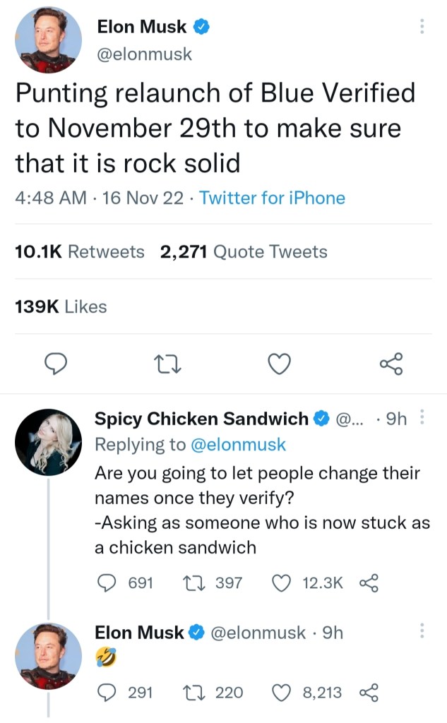 Elon Musk says the new Twitter Blue, which lets you pay $7.99 per month for a blue verification check mark next to your name, will relaunch on November 29th.