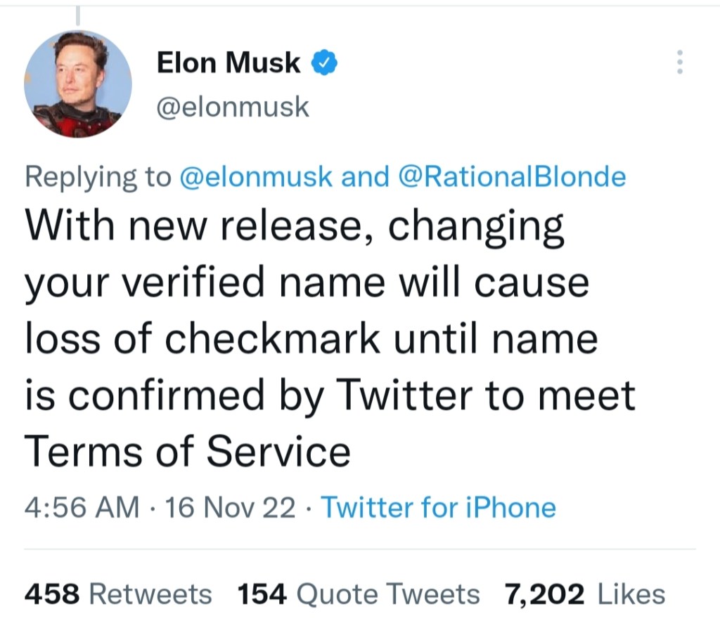 With the relaunched Blue, Musk says that evolving your “checked name” will make you lose your mark of approval until that name is affirmed by Twitter. Be that as it may, subsequent to laying off around 50% of the organization, a huge number of provisional laborers, and terminating a few disagreeing workers, there may not be many individuals left to do those affirmations as a matter of fact.